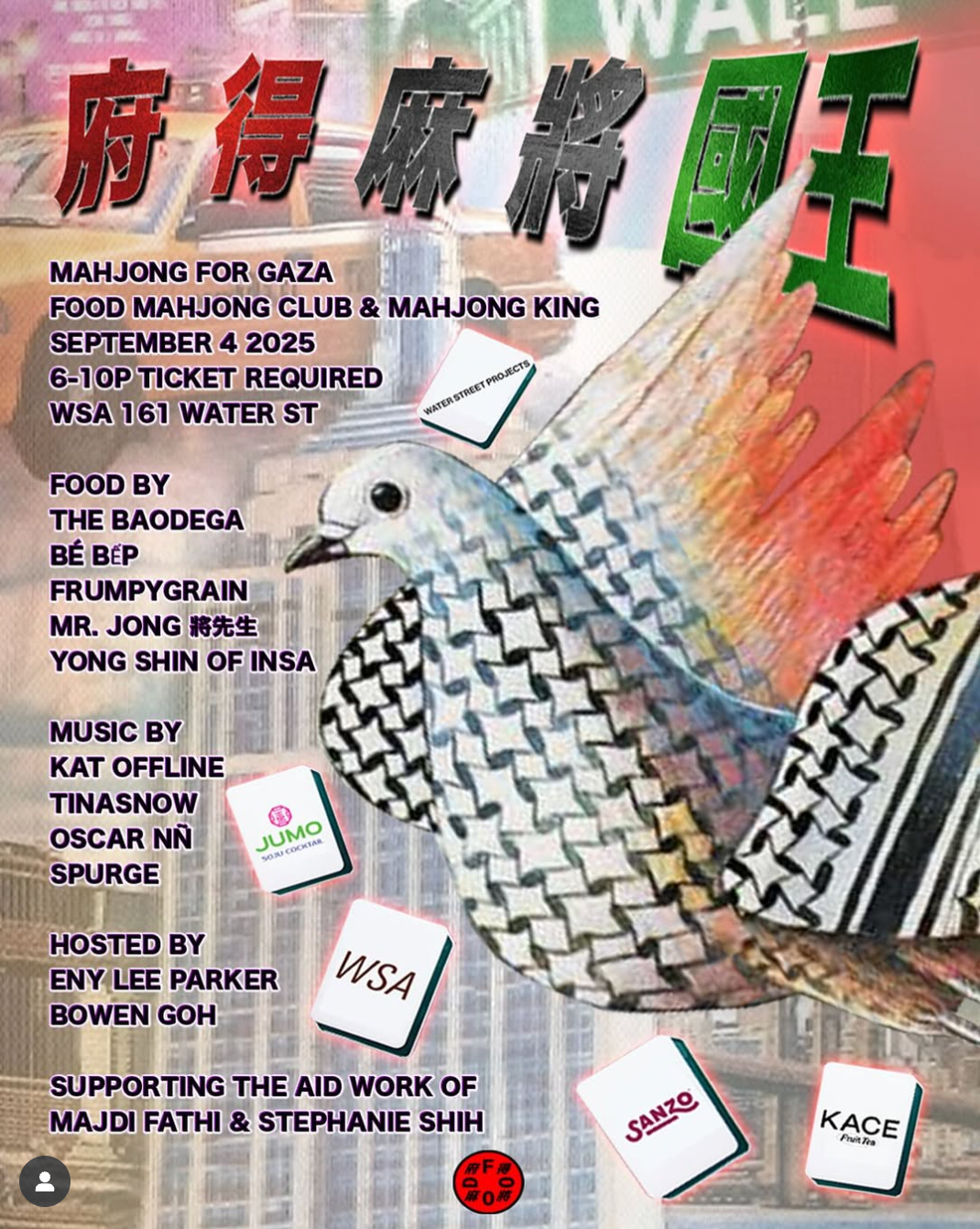 Sept 4 6-10pm, hosted by Mahjong King & Food Mahjong Club. 100% proceeds going towards food and supplies for families in Gaza. Tickets include food by Bé Bếp, Frumpygrain, Mr. Jong, Yong Shin of Insa, and me...drinks... music all night from a sick lineup of DJs... and 4 hours of MJ open play & tournament at WSA!